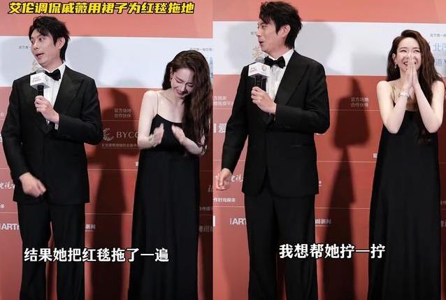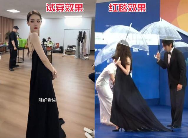 戚薇穿的是黑色吊带露背礼服,雨水让布料紧贴身体,裙摆拖在地上难以提起。她的伴侣全程跟在身后,帮忙提起裙摆。精心打理的波浪卷发也被雨淋得失去了原有的弧度。事后有人提起这件事,现场的狼狈中带着一丝生活化的幽默。雨水一点点渗透的过程,让人想起日常中那些无法完全避开的意外。