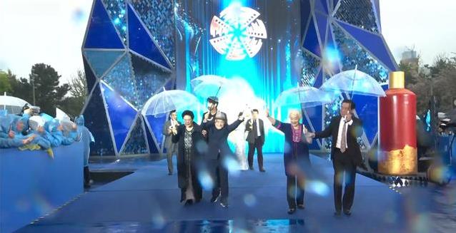 老一辈演员牛犇、斯琴高娃、祝希娟、吴玉芳互相搀扶着前行。他们年纪较大,在湿滑的地面上格外留意脚步。积水坑洼遍布,稍有不慎就可能滑倒。大家就这样小心翼翼地走完这段红毯,镜头前留下的画面多了几分真实的生活气息。