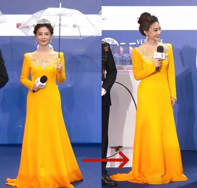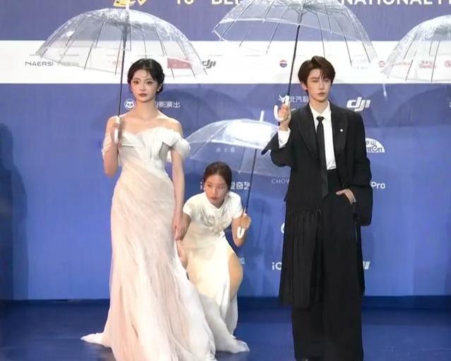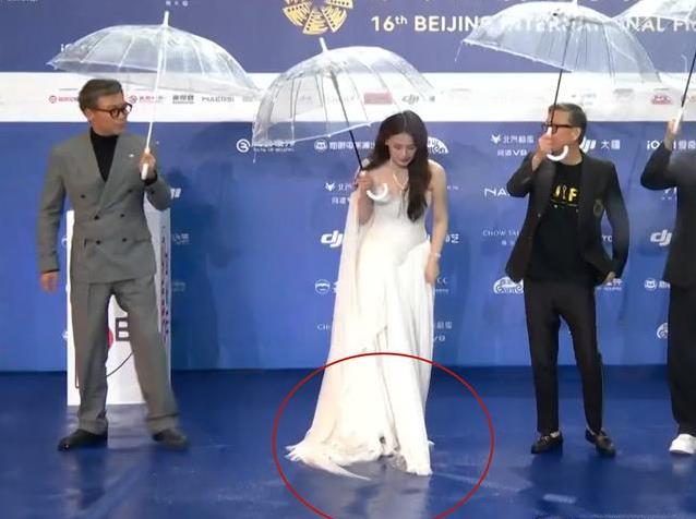 许多女演员的长裙成了最直接的受影响对象。裙摆拖在积水中,像吸饱了水的布条一样沉甸甸的。马思纯选择了一件纯白纱裙,本想呈现出轻盈唯美的样子。走过红毯后,裙摆完全湿透,紧紧贴在一起。她低头查看时,表情明显有了变化。原本飘逸的仙气,在雨水的浸润下暂时收敛起来。