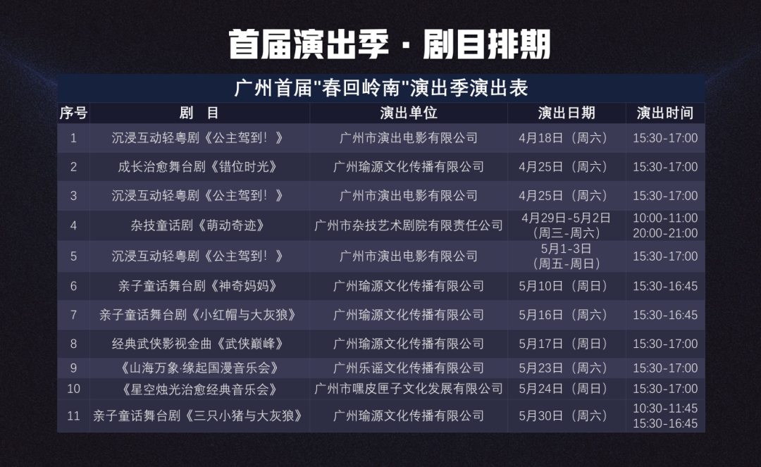 本届“春回岭南”演出季聚合舞台剧、音乐会、儿童剧、杂技、沉浸式互动演出等多元艺术形式,剧目涵盖引进精品与岭南原创,覆盖亲子家庭、年轻白领、文艺爱好者等不同观众群体的审美需求。